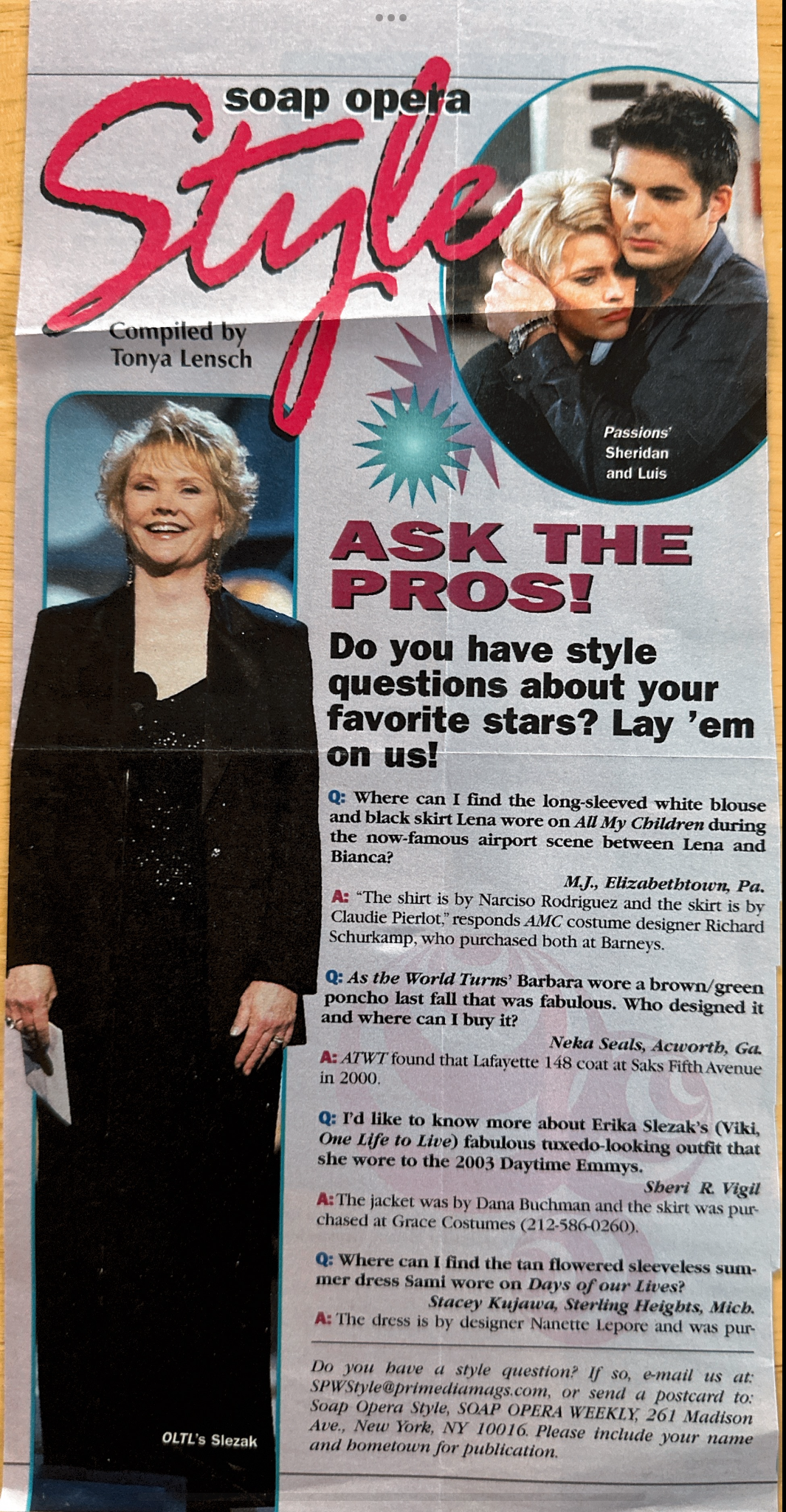 2003 Soap Style May 8 Written By Walter Miller Soap Opera Style, Ask the Pros compiled Tonya Lensch Walter Miller